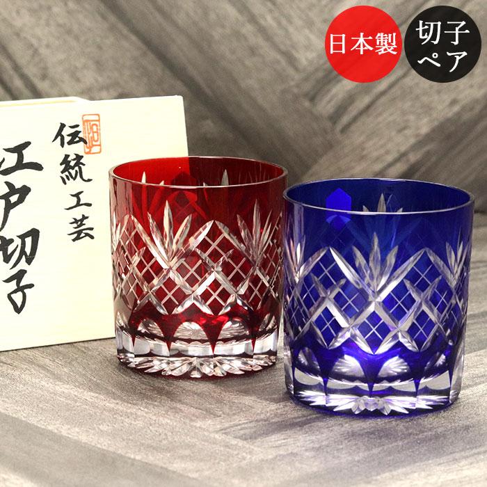 楽天市場 江戸切子 ペアグラス 切子グラス ロックグラス 重ね矢来文様 菊底 青 赤 木箱 ギフトセット 田島硝子 名入れプレゼント 夢彩工房