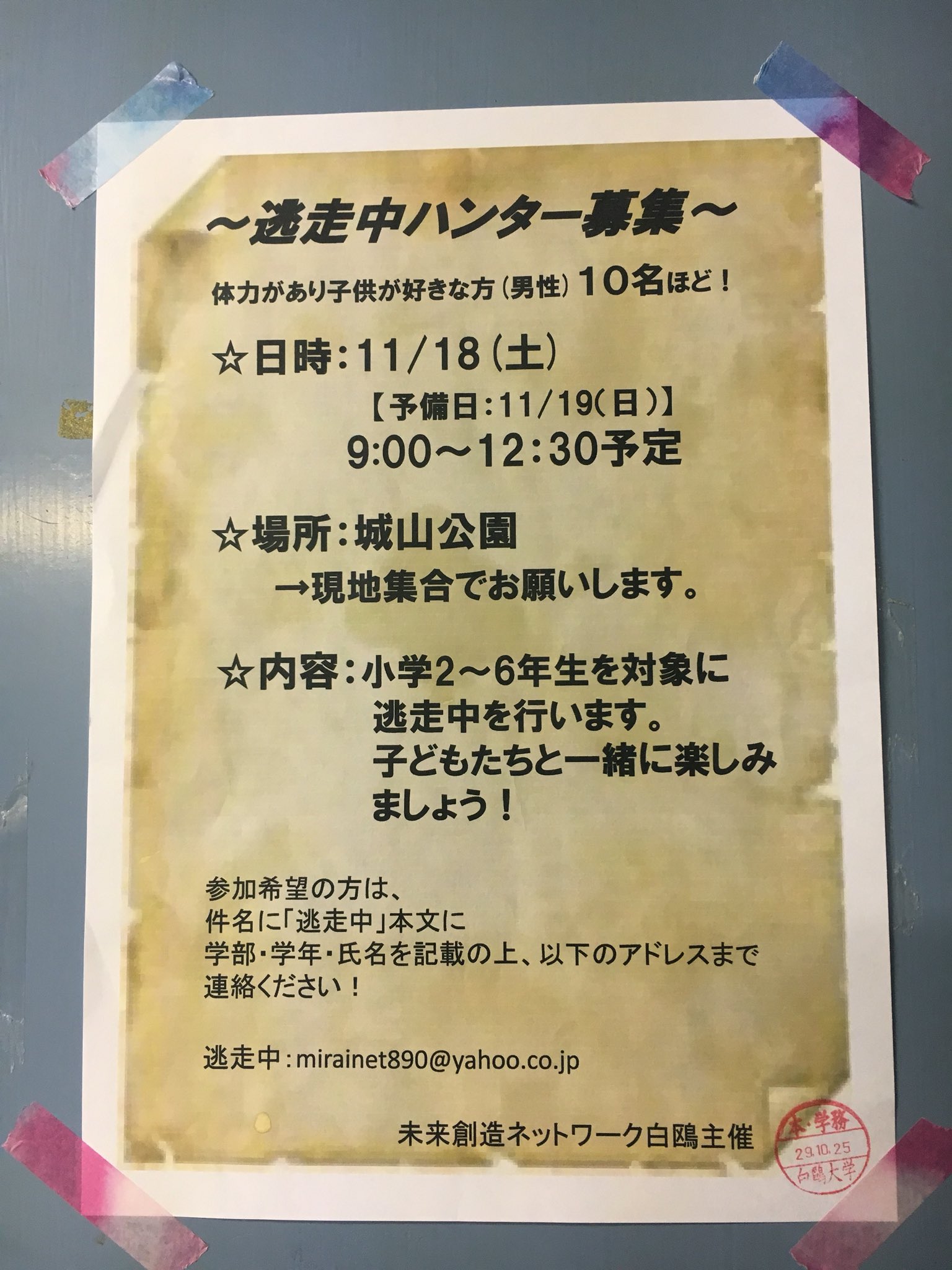 트위터의 未来創造ネットワーク白鷗 님 逃走中ハンター募集 11月18日 土 に地域の子どもたちと逃走中を行います 走ることが好きな人 子どもが好きな人 募集しています 希望者はチラシに記載されたメールアドレスまでご連絡ください 運営スタッフも募集し